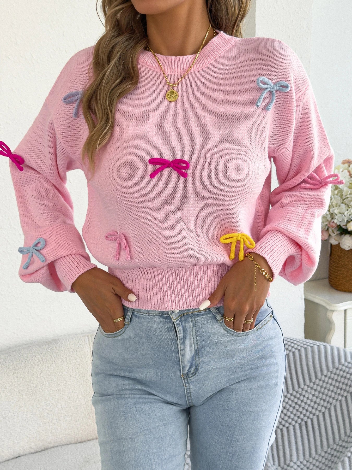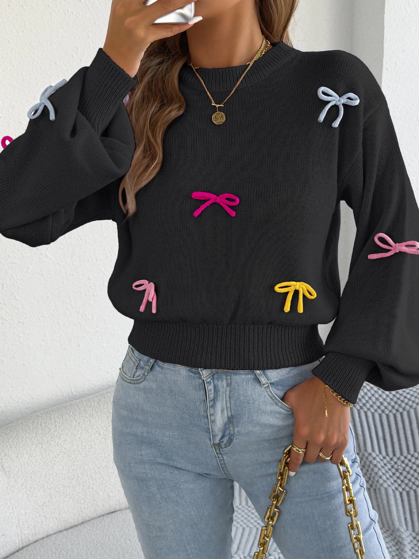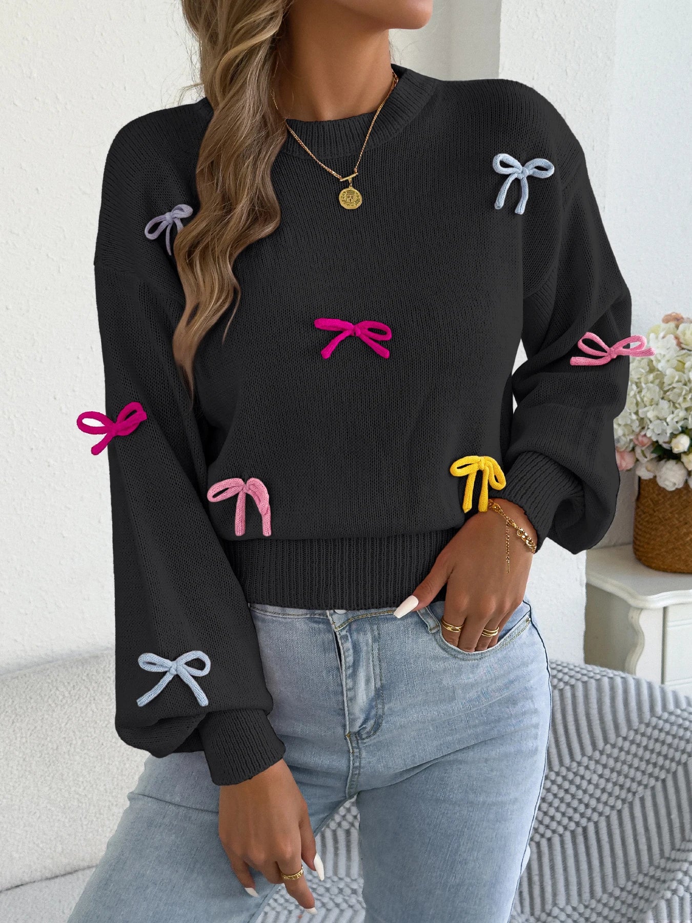 Contrast Bow Lantern-Sleeve Knit Sweater