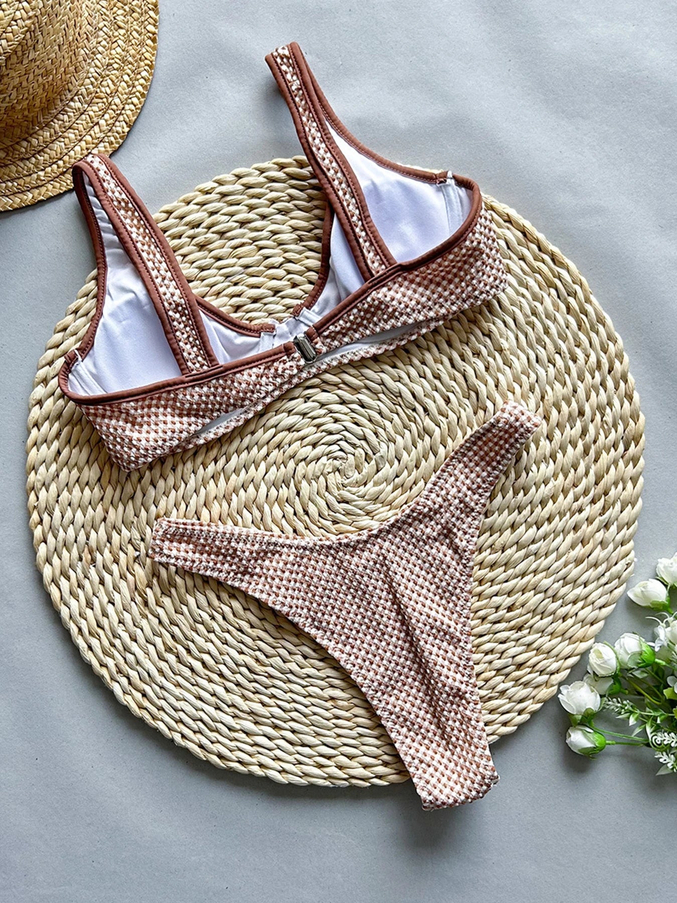 This plaid two-piece bikini combines support and style with underwire push-up design. Quick-drying and water-resistant, perfect for confident summer wear....