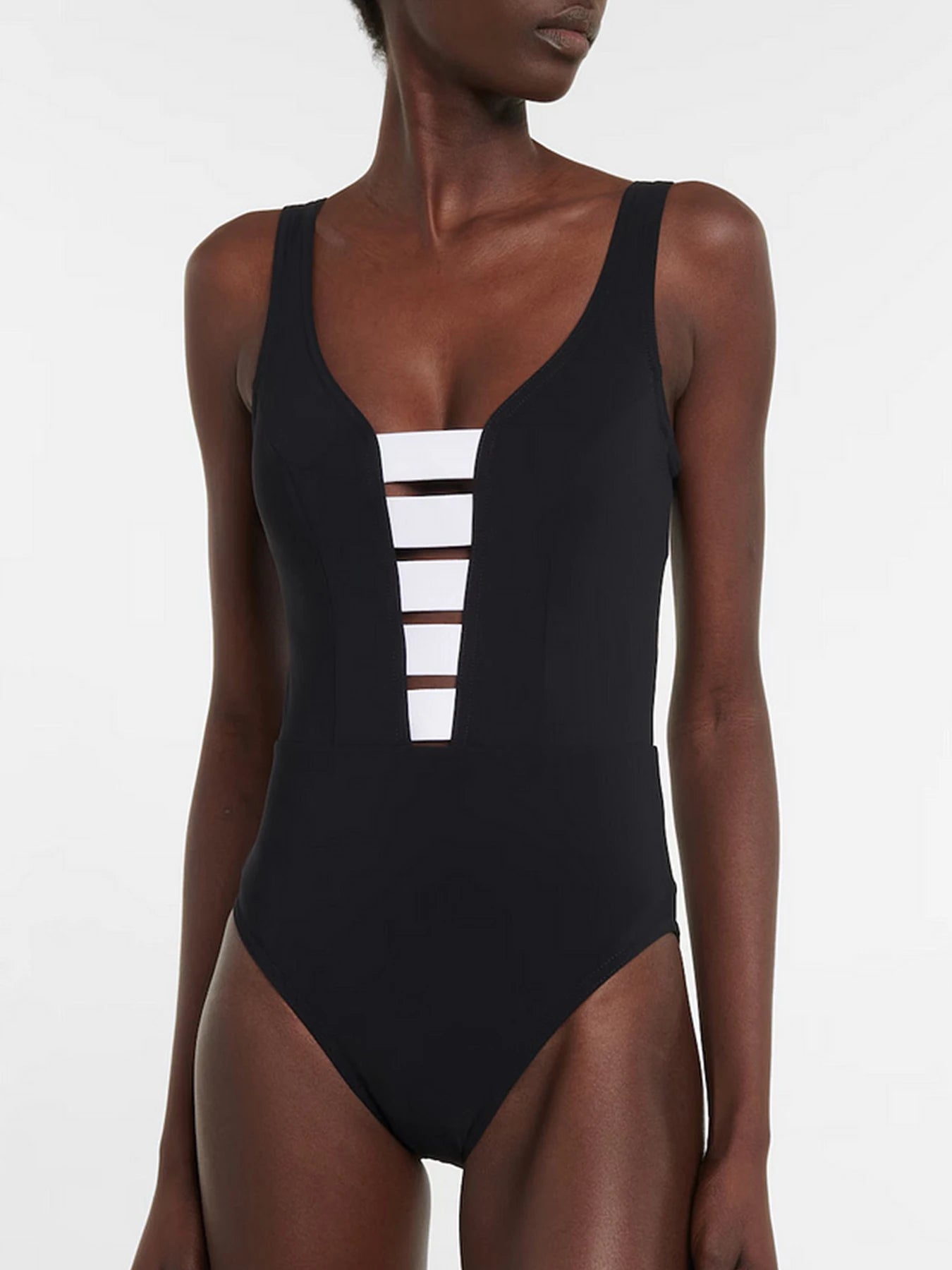This V-neck monokini features a body-flattering splice design. Quick-drying and water-resistant, it offers comfort and sculpting support for all-day wear....