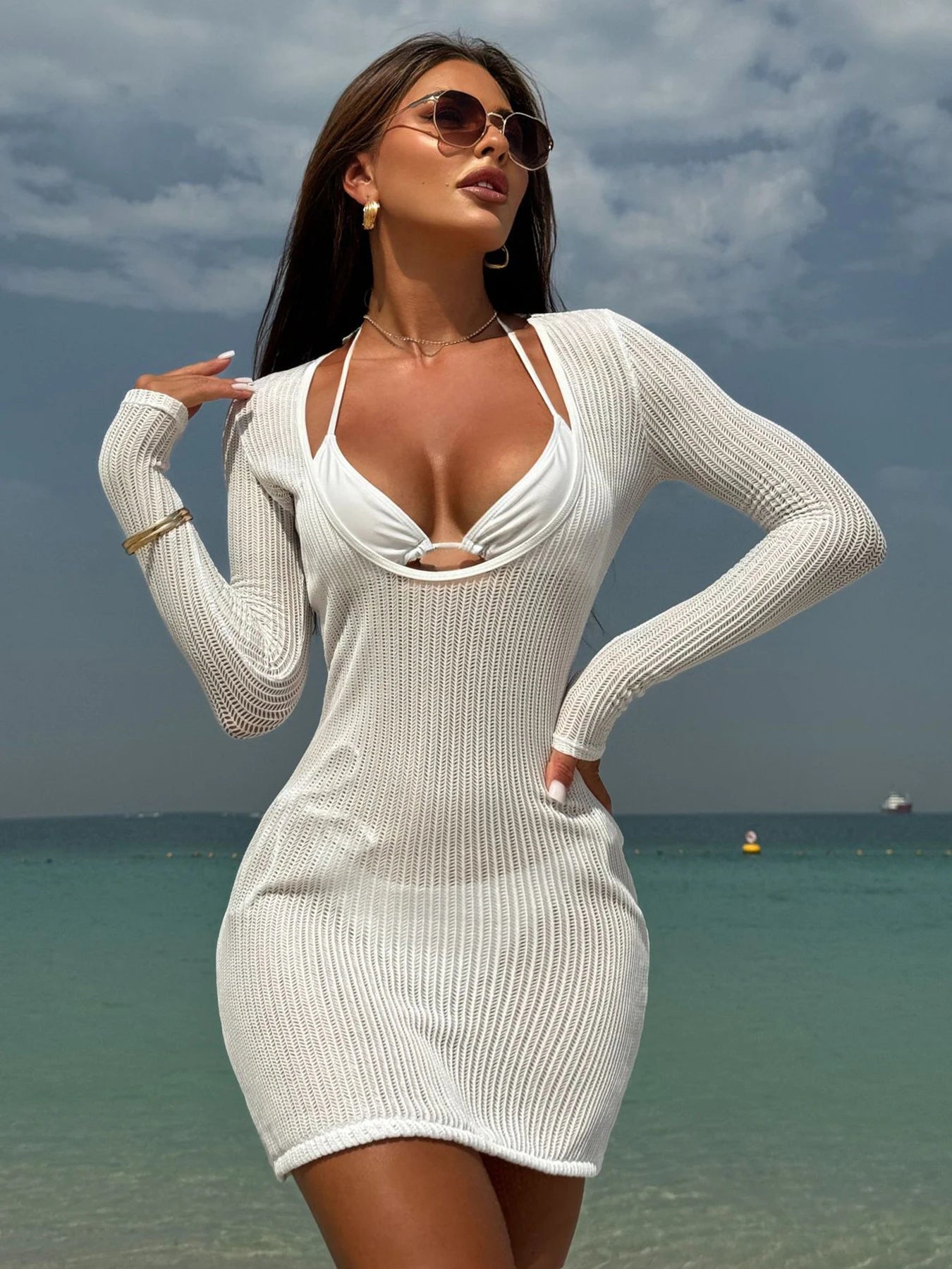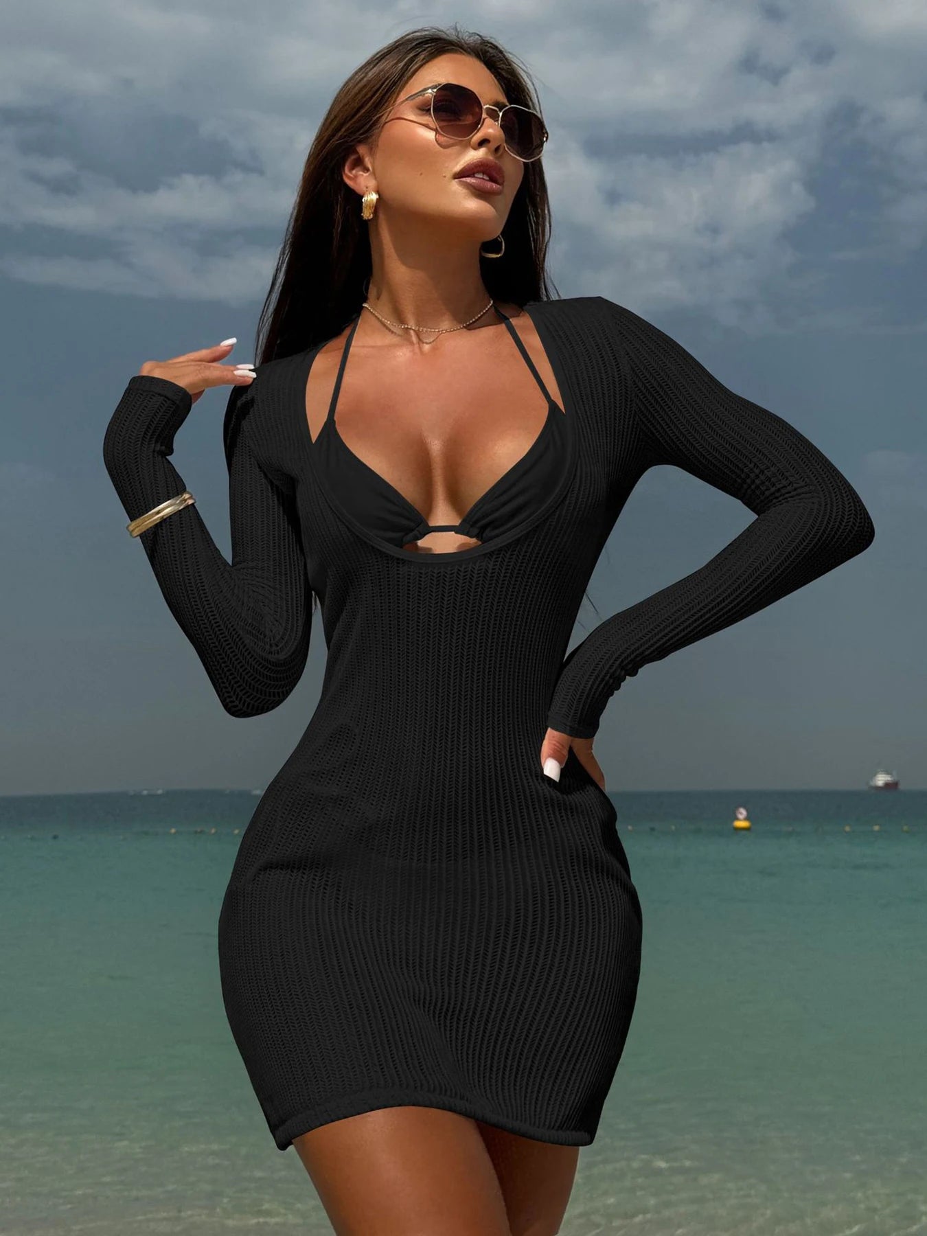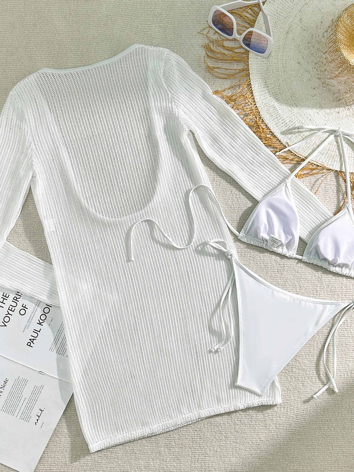 This three-piece set includes bikini and long-sleeve cover-up. Crafted from premium stretch fabric, quick-drying and water-resistant for stylish, comfortable beachwear....