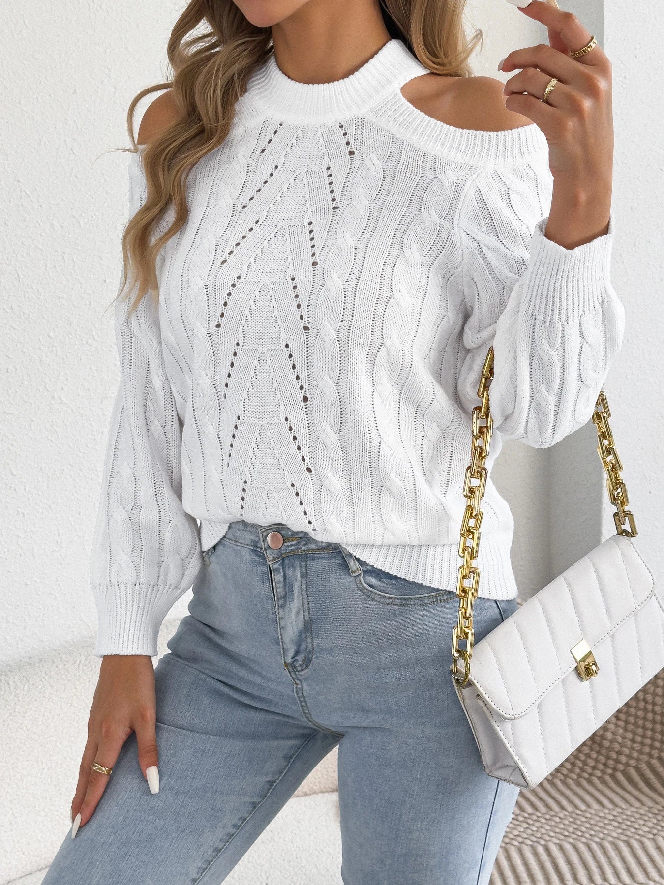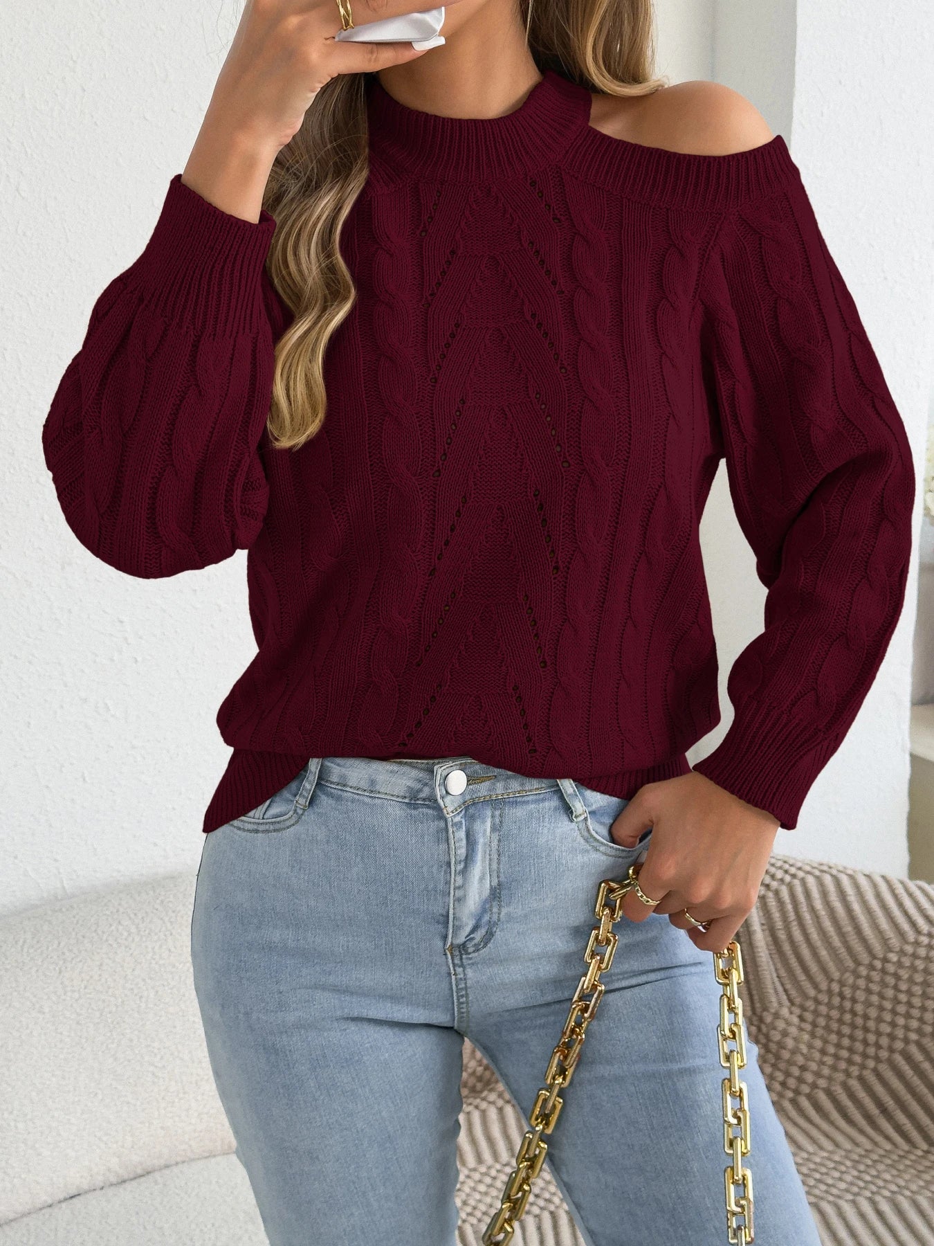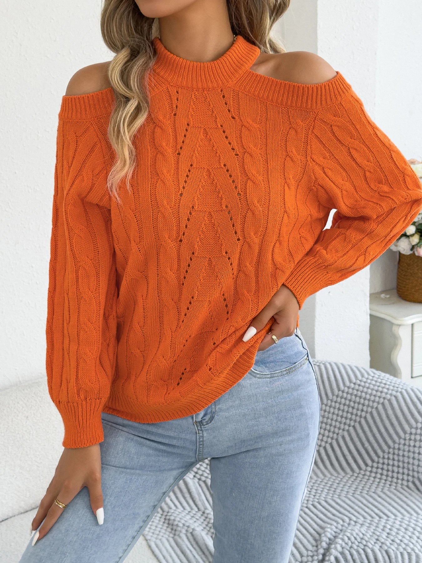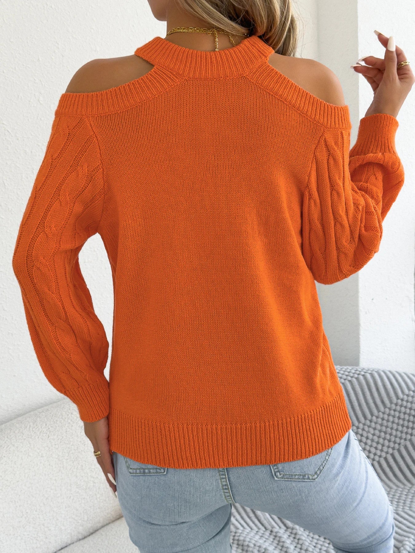 Off-Shoulder Hollow-Out Lantern-Sleeve Sweater