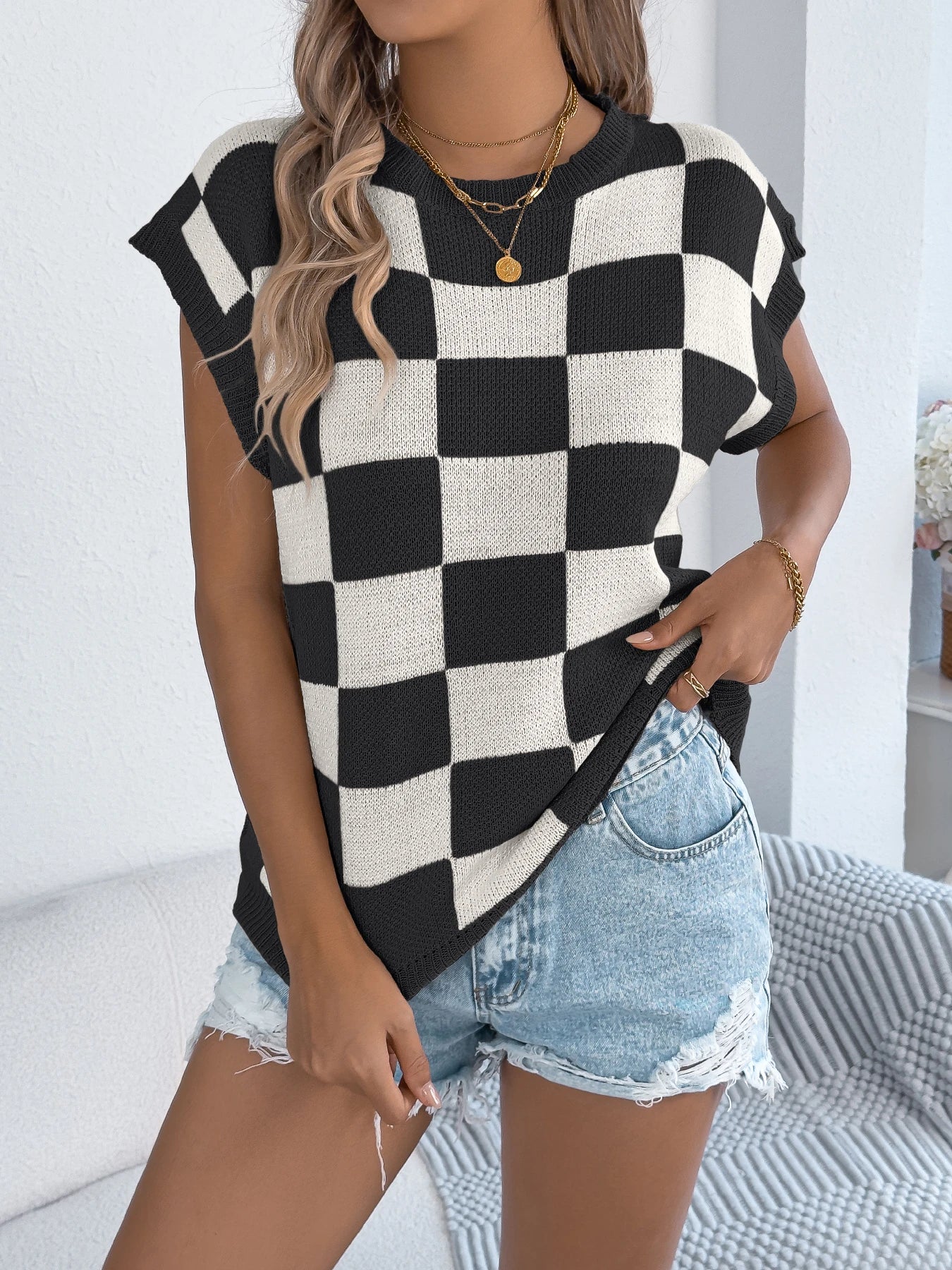 Color Block Plaid Short Sleeve Knit Top