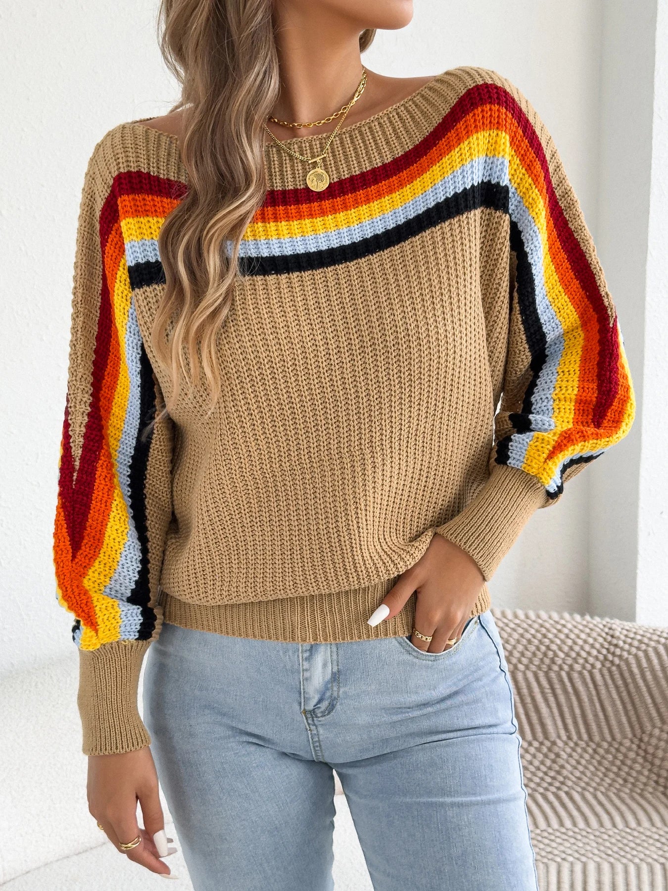 Contrast Striped Lantern Sleeve Sweater