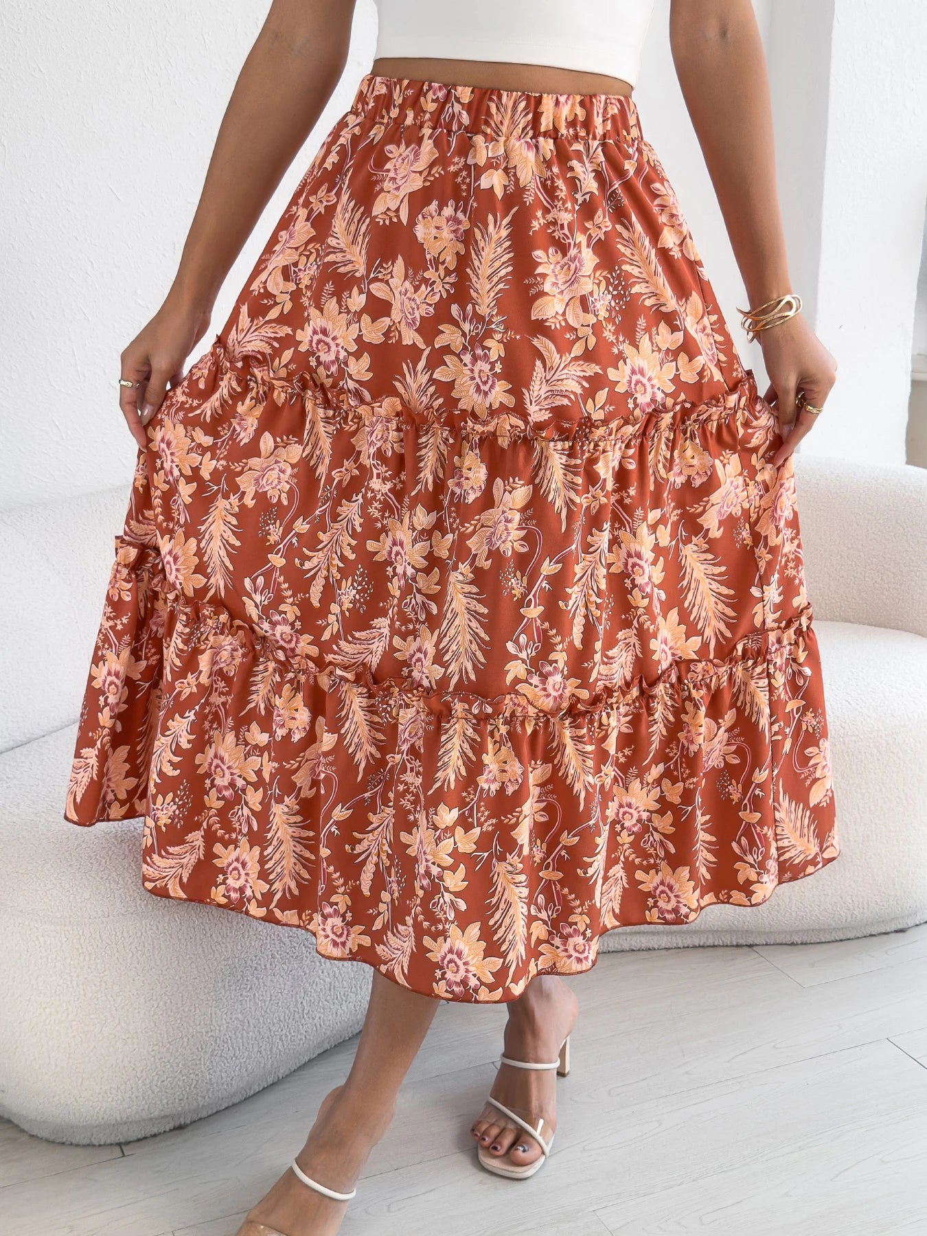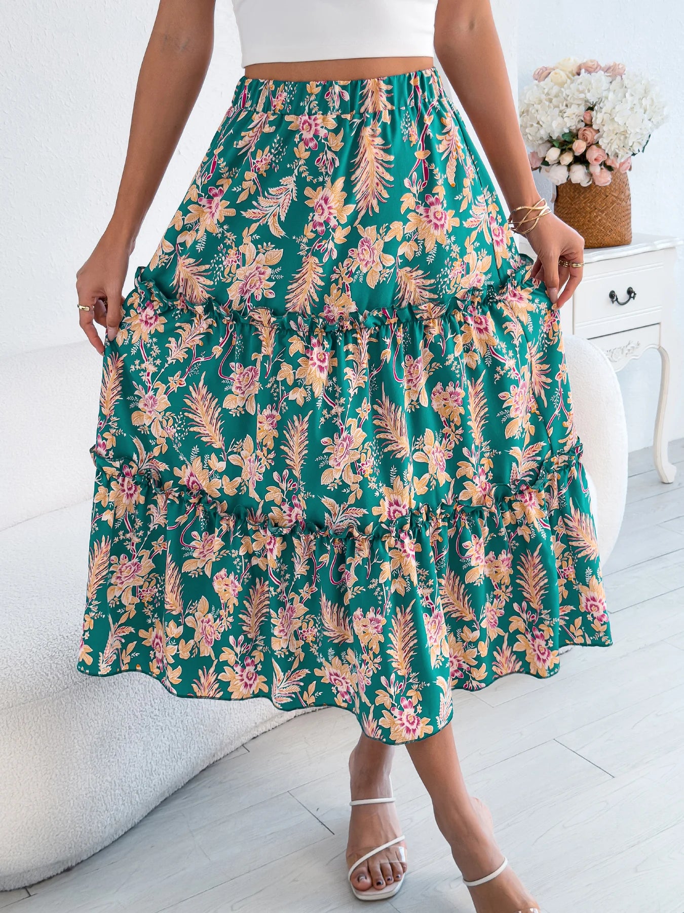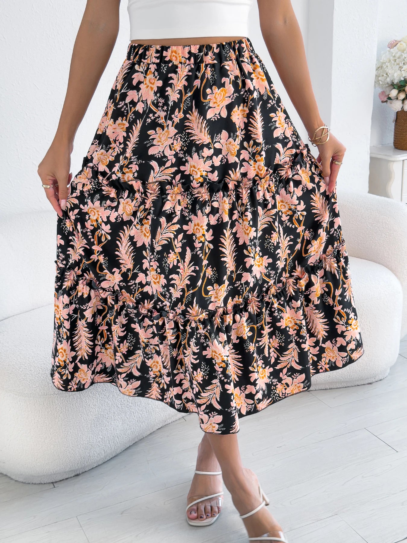 Floral Print Elastic Waist Ruffled Skirt
