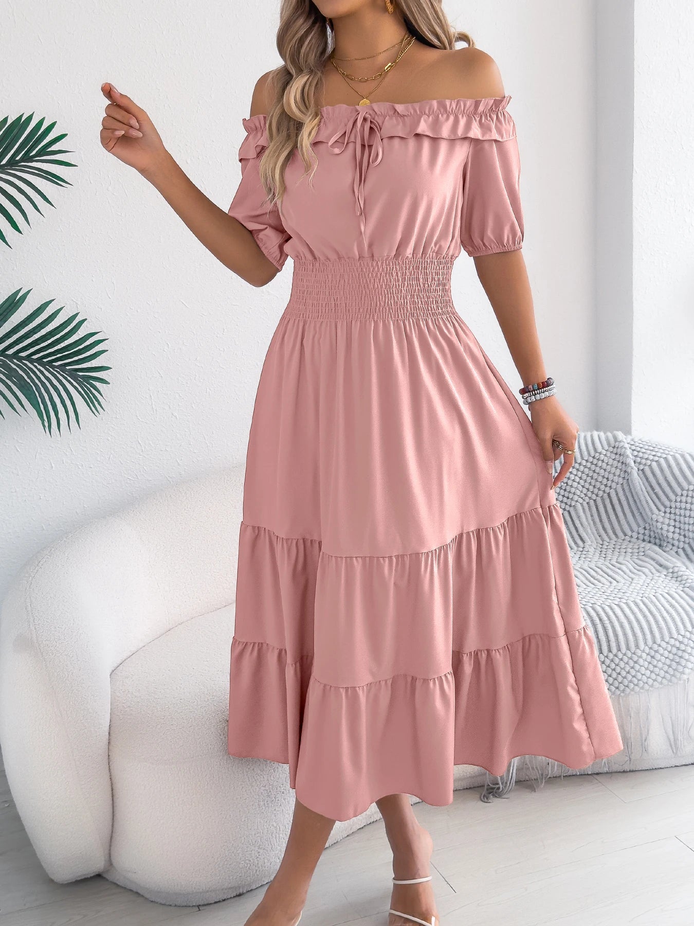 Off Shoulder Waist Cinched Lotus Leaf Edge Dress