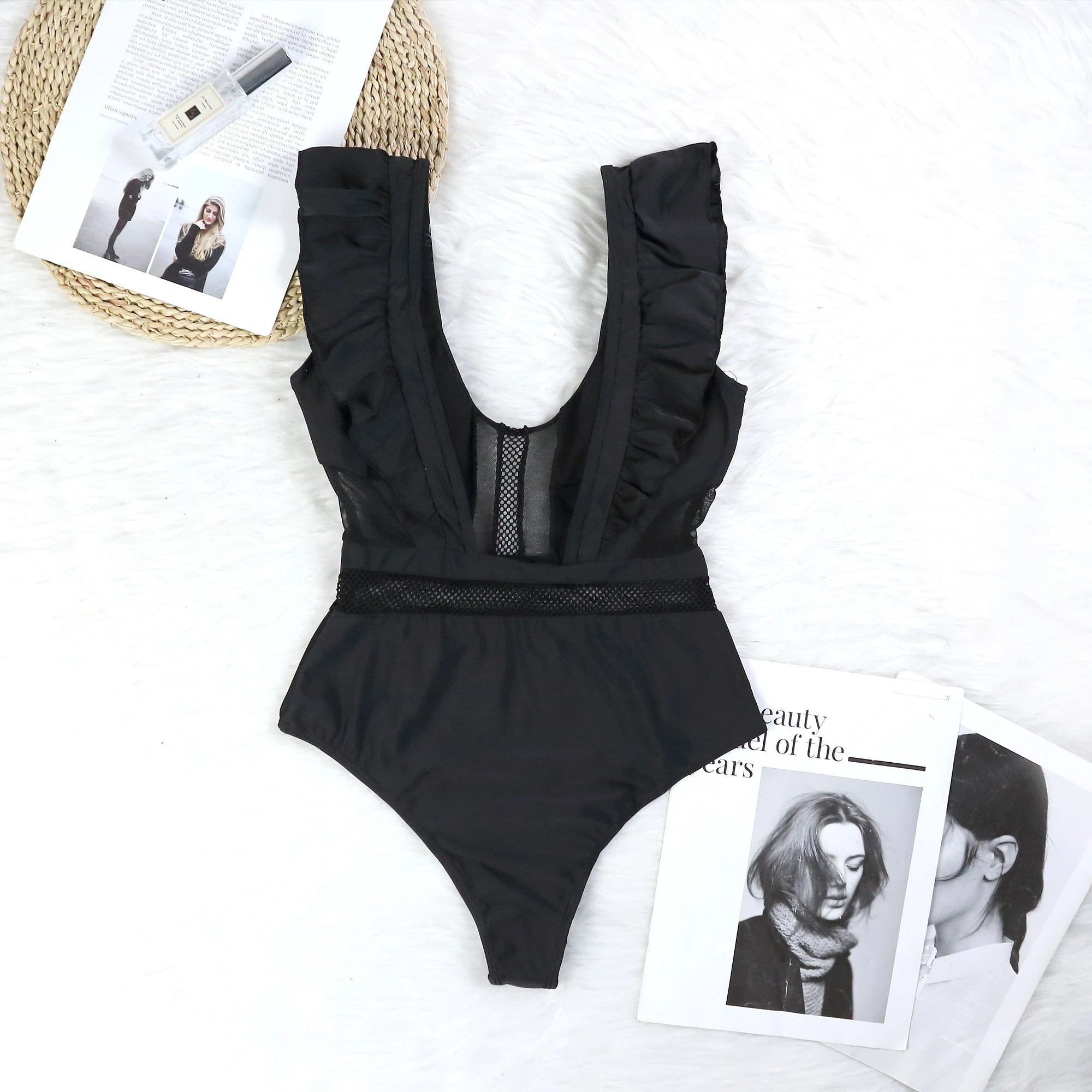 This black monokini features ruffle mesh panels with push-up support for a flattering fit. Quick-drying and water-resistant, ideal for beach...