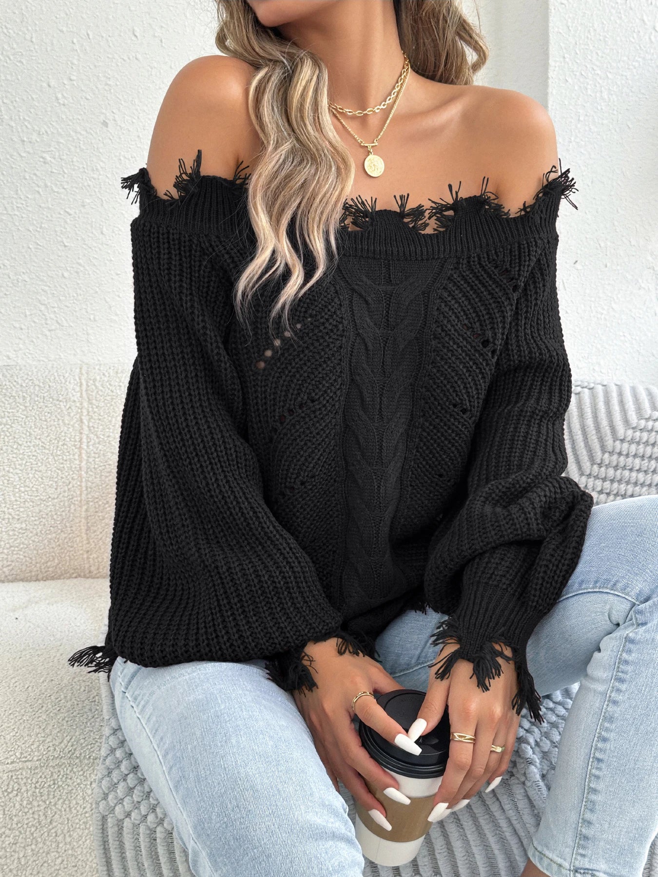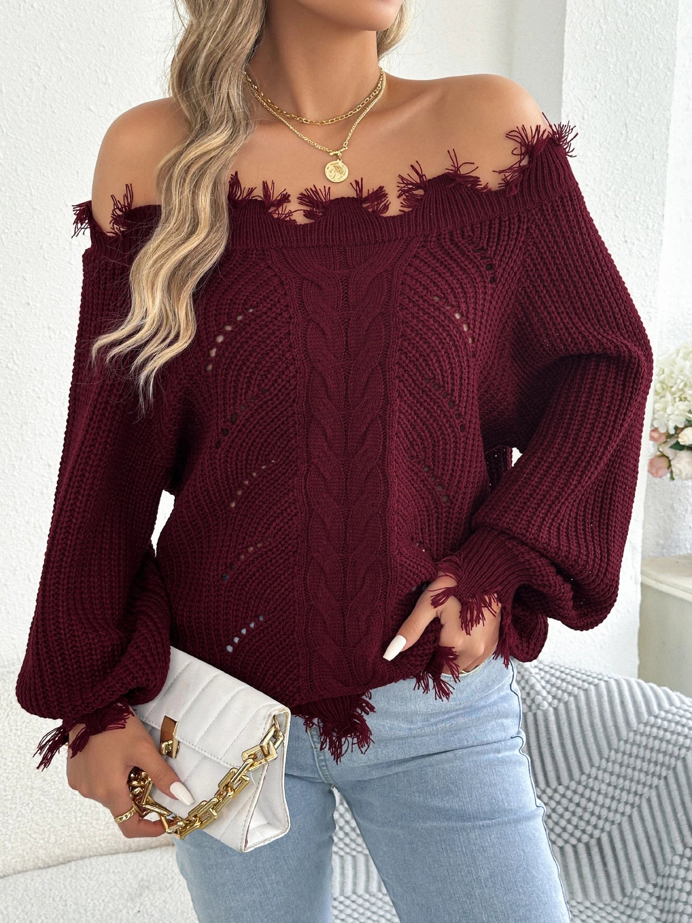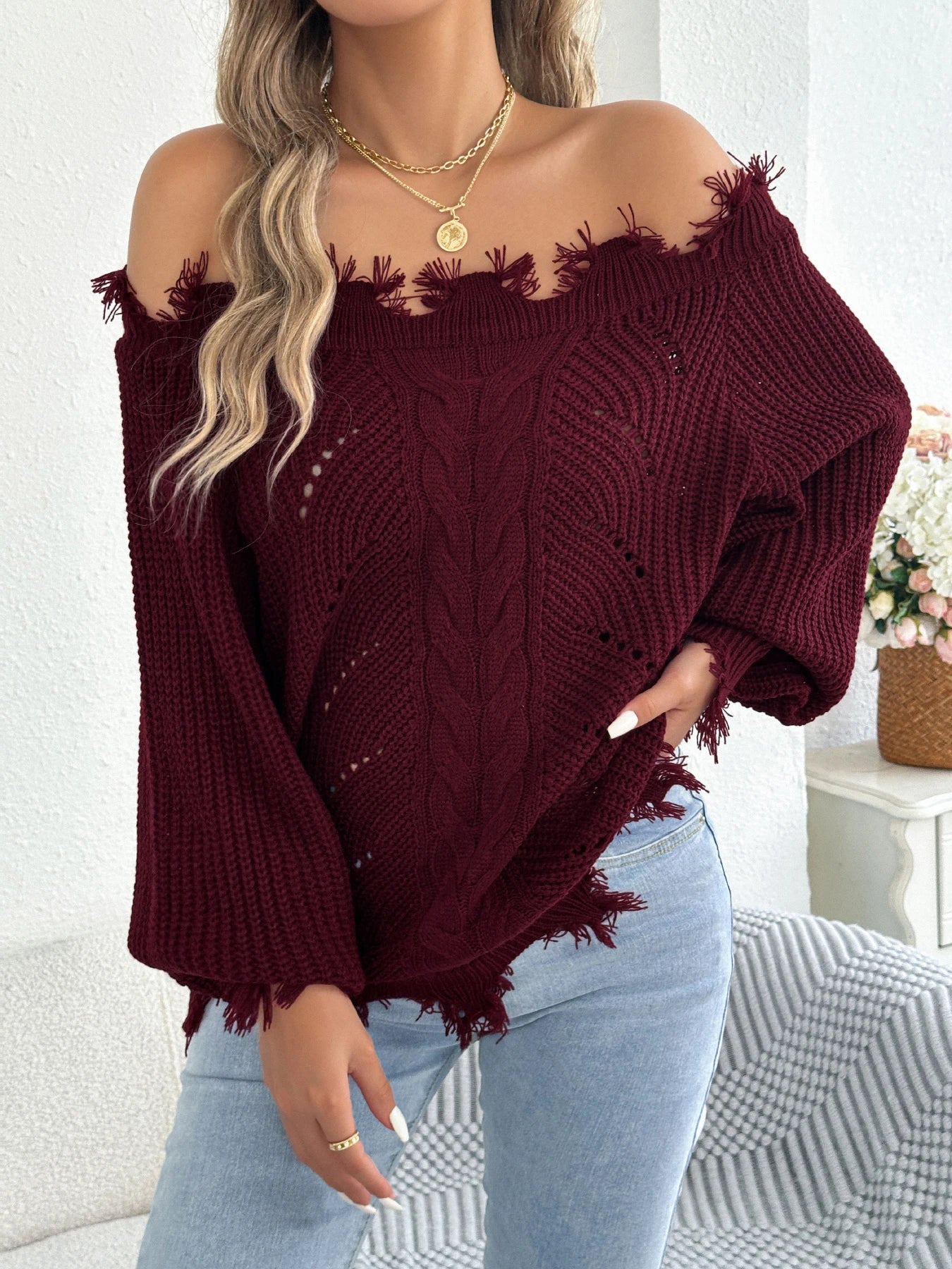 Slash Neck Tassel Sweater