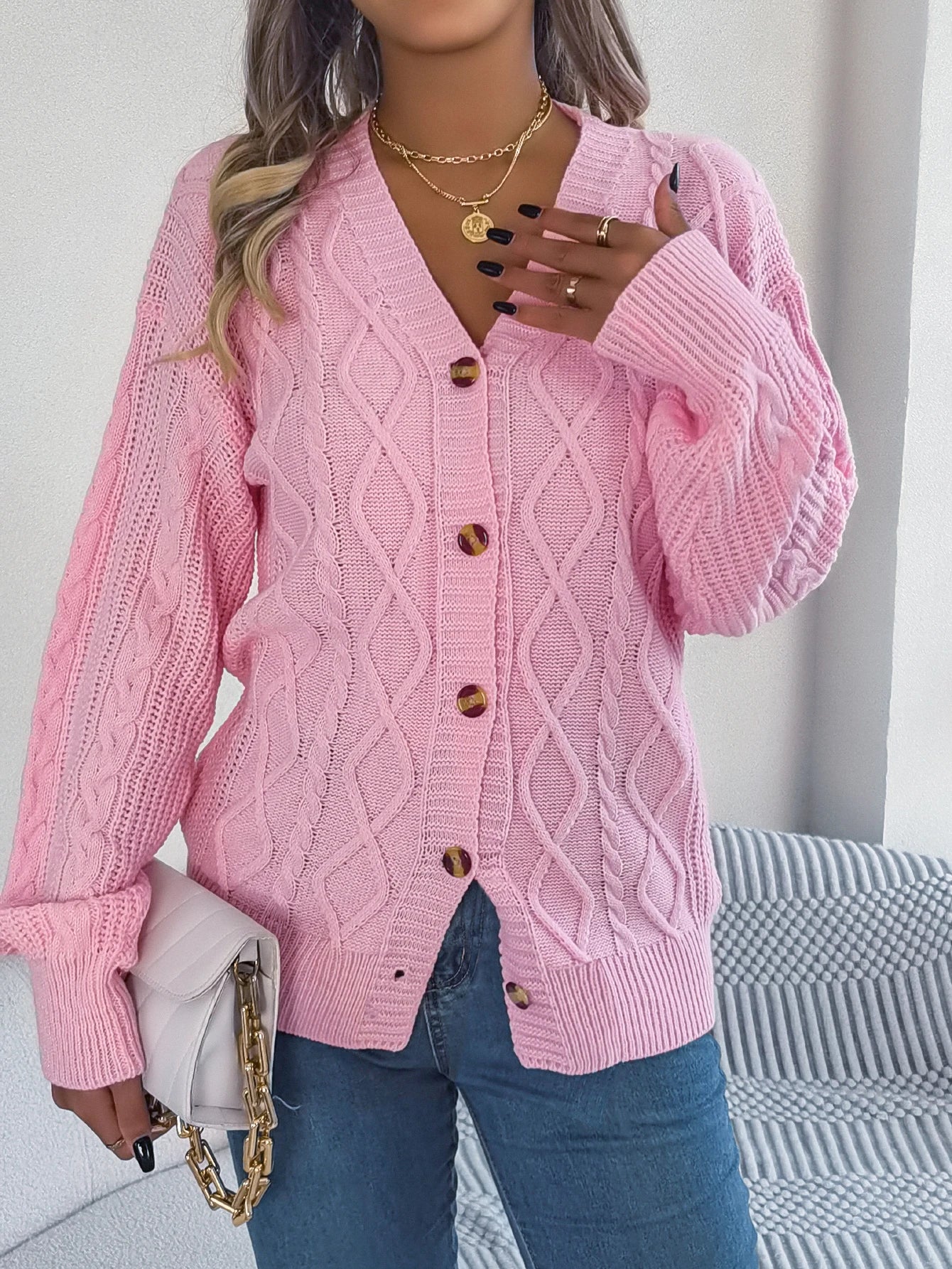 Soft twist-knitted cardigan with a v-neck and classic buttons for easy layering.